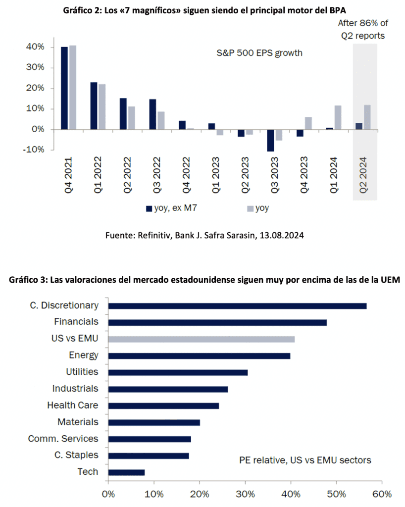 Los 7 Magníficos han aportado una vez más la mayor parte del crecimiento del BPA en el S&P 500, aunque NVIDIA aún tiene que comunicar sus cifras del segundo trimestre (28 de agosto). Eliminándolos del agregado del S&P 500, el crecimiento interanual del BPA del índice cae del 12% al 3,2%, lo que seguiría siendo la tasa de crecimiento más alta desde el cuarto trimestre de 2022, pero notablemente inferior a la cifra de dos dígitos si se incluyen todos los componentes del S&P 500 (Gráfico 2). Como nota positiva, la ampliación de la recuperación de los beneficios es definitivamente visible en los datos del segundo trimestre. Por el contrario, el crecimiento de los beneficios subyacentes sigue siendo muy lento. Esto lleva a preguntarse si la gran prima de valoración de los sectores estadounidenses frente a otras regiones está justificada, en particular teniendo en cuenta que otras regiones están produciendo tasas de crecimiento de los beneficios similares fuera de la tecnología (Gráfico 3).