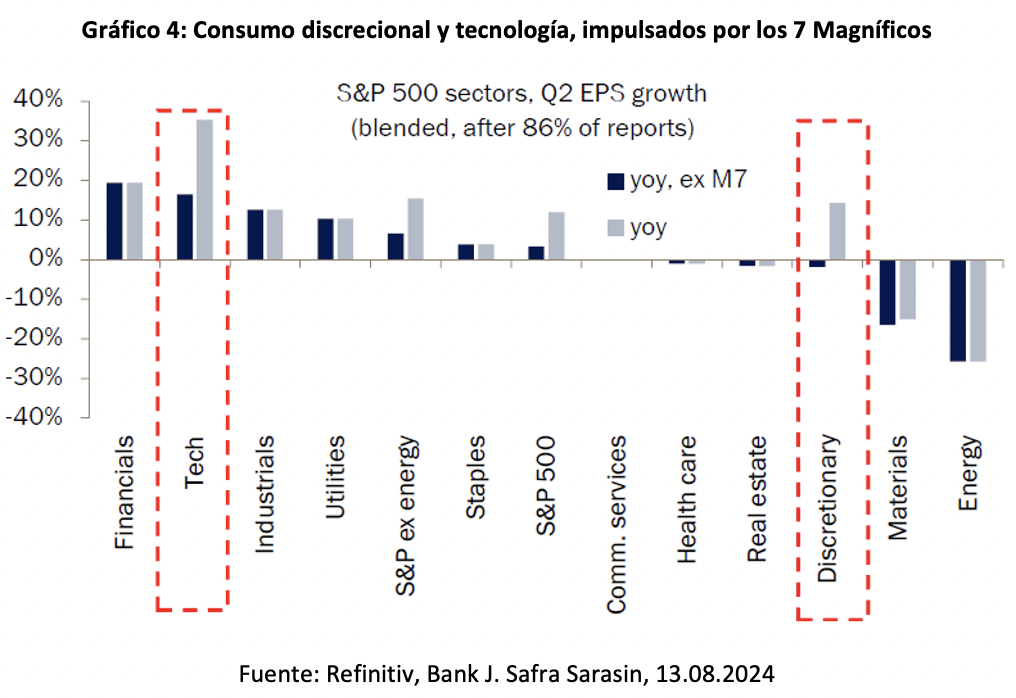 Estas cifras no son motivo de preocupación, aunque una vez más estén impulsadas principalmente por los «7 magníficos». El único segmento del mercado que se ha mostrado notablemente más débil es el de consumo discrecional. Si se eliminan los pesos pesados Amazon y Tesla del agregado de consumo discrecional, el sector registró la primera caída interanual del beneficio por acción (BPA) desde principios de 2021. Las cifras débiles se han visto acentuadas por los comunicados de la dirección, que en muchos casos ha señalado una disminución de la demanda de los consumidores, impulsada por el extremo inferior de la distribución de ingresos. Las áreas más específicas de debilidad han sido los viajes, las reformas del hogar, los automóviles, los bienes duraderos y la comida rápida, donde se ha producido una notable moderación por parte de los consumidores, lo que pesa sobre los resultados del segundo trimestre.