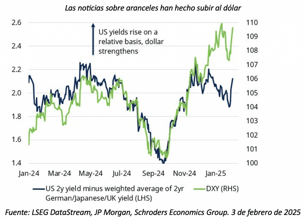 George Brown y David Rees (Schroders) | El agresivo uso de las amenazas arancelarias por parte de Trump está sacudiendo los mercados. Nuestros economistas analizan el posible impacto. Las acciones mundiales cayeron el lunes 3 de febrero y el dólar subió tras la noticia de que EE.UU. planeaba aplicar aranceles a los bienes procedentes de México, Canadá y China, a partir del martes 4 de febrero. Más tarde, ese mismo día, se supo que los aranceles a México y Canadá no se aplicarían según el calendario original, sino que se pondrían en pausa durante un mes, lo que provocó un nuevo cambio en la reacción del mercado. China contraatacó con aranceles del 10-15% sobre una serie de productos estadounidenses (a partir del 10 de febrero) y una investigación antimonopolio sobre Google.