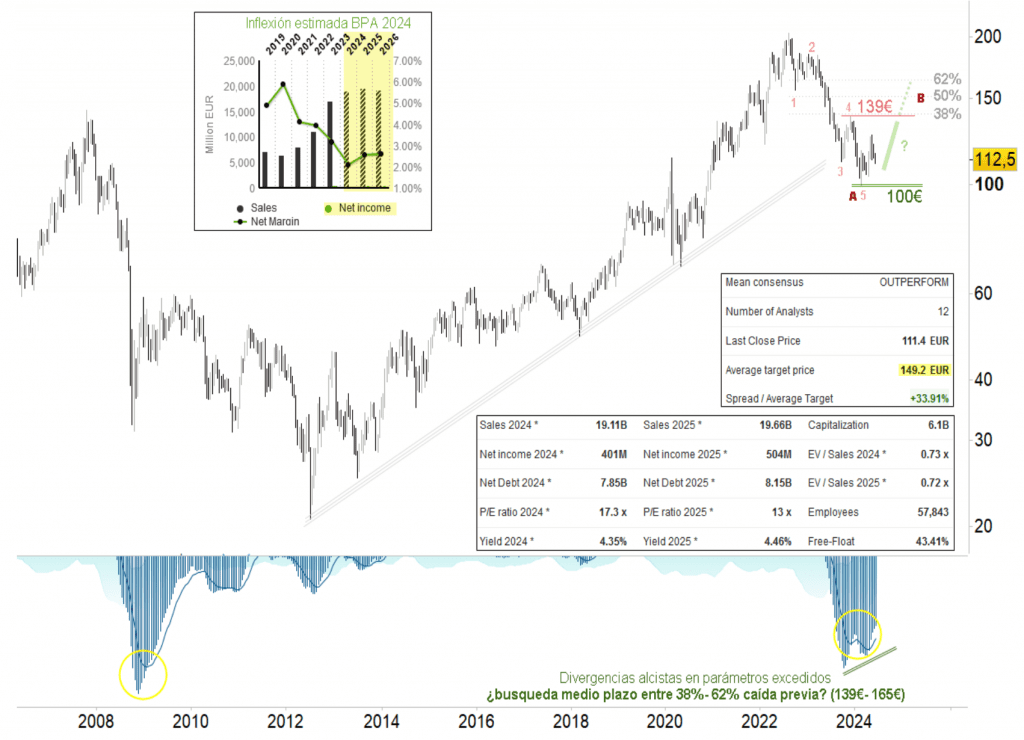 Renta 4 | La caída desde los máximos de 2022 se ha desarrollado en cinco ondas bajistas, deteniéndose en niveles de 100 euros, dejando lecturas de sobreventa históricas, así como importantes divergencias alcistas, propias de un rebote de cierta importancia. Esperaríamos una recuperación que al menos alcanzara un 38% de lo caído, que coincidiría con la zona de resistencia formada por los máximos de diciembre en 139 euros, niveles próximos a los objetivos del consenso de analistas. La zona de soporte en 100 euros se presenta clave en este escenario de recuperación.