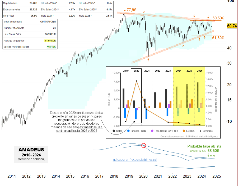 Renta 4 | Desde que en 2019 registrara máximos históricos en 77,8 euros, tras una revalorización cercana al 800% desde su vuelta a bolsa en 2010, el precio viene constriñéndose. Los puntos tácticos clave se constituyen entre el paso de la directriz bajista desde 2010, que marca resistencia clave en 68,50 euros (máximos junio 2023 así como de enero y junio de este año), y el paso de la directriz alcista desde 2020, que presenta un soporte clave en 51,50 euros. La resolución de este rango se antoja clave, en vistas de la anómala situación de las bandas de precio, así como de sus indicadores lentos, cercanos a iniciar una fase alcista si el precio confirma la superación de