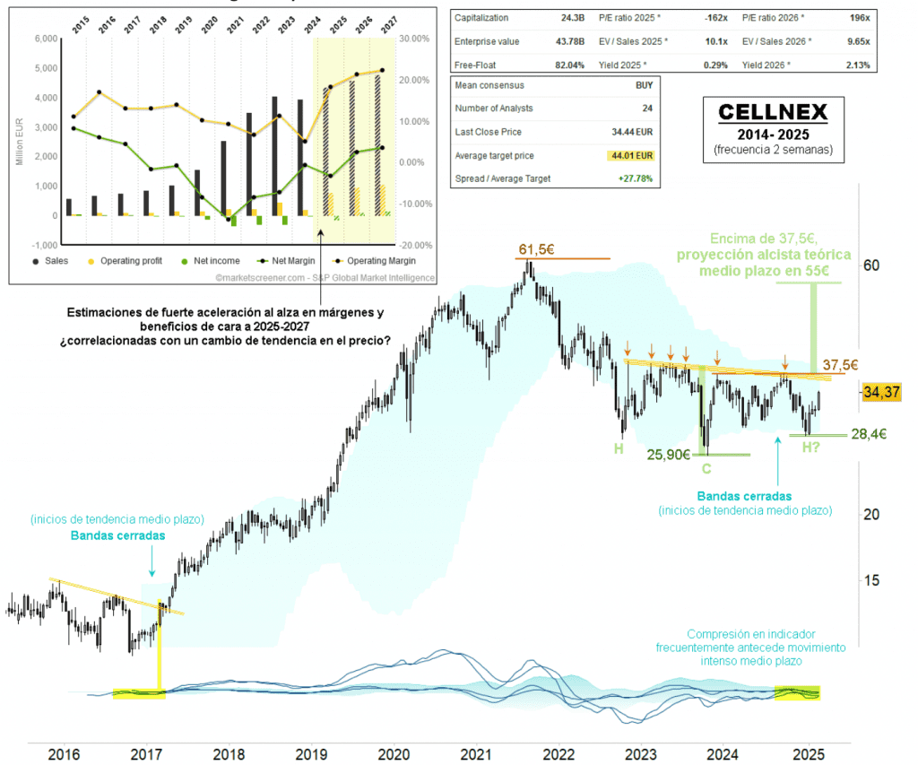 La verdadera importancia radica en la compresión que presentan sus indicadores lentos, así como el cierre en sus bandas, situaciones que preceden movimientos de tendencia intensa en siguientes meses. A nuestro juicio, la superación de 37,5 euros, al margen de correcciones, activa escenarios positivos de medio plazo, con proyecciones alcistas teóricas hacia 55 euros. Nótese el refrendo de las estimaciones de los analistas en los crecimientos de cara a 2025-2027, cambiando la tendencia al alza en márgenes y beneficio neto.