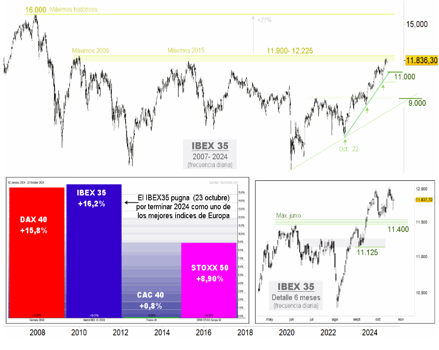 El Ibex35, entre 11.900 y 12.225 puntos, máximos de 2009 y 2015, por encima de los que libera su camino hacia los récords del año 2007 en 16.000 puntos