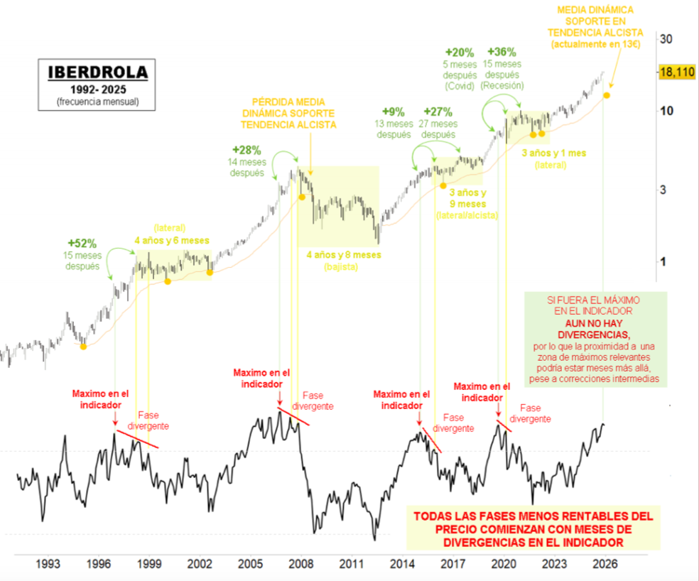 En esta evolución destacamos los periodos en los que la acción ha mostrado un comportamiento menos rentable, bien en periodos bajistas o laterales, durante varios años. Si atendemos a los indicadores mensuales, apreciamos cómo todos esos periodos vienen precedidos de fases divergentes en el indicador (el precio marca nuevos máximos sin que el indicador los secunde). Actualmente el indicador y el precio comparten nuevos máximos, lo que invita a pensar en que, pese a que el precio pueda experimentar correcciones de cierta intensidad, un máximo relevante en el precio probablemente estaría meses por delante. También se aprecia cuál es el nivel clave de tendencia alcista, actualmente en 13 euros, por el paso de la media que viene adaptándose a las correcciones desde los mínimos del año 2012.