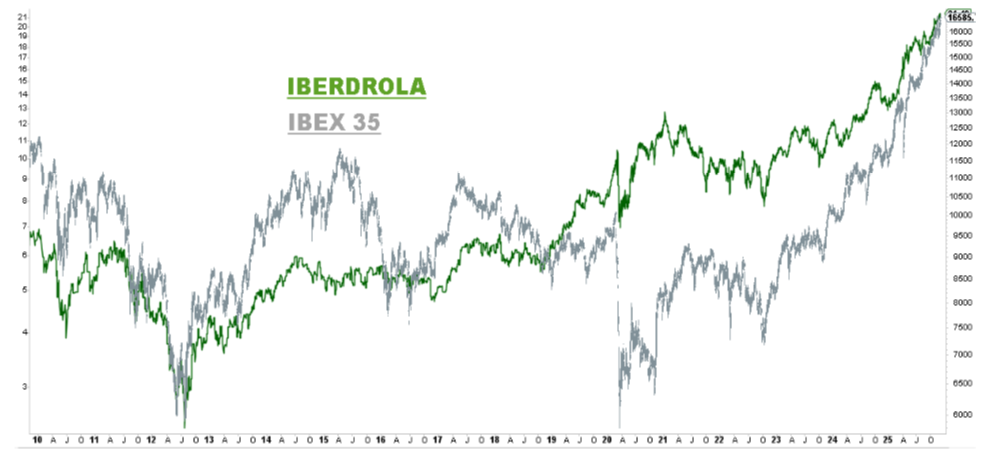 Renta 4 | Para intentar acercarnos a la respuesta de esta pregunta exponemos el gráfico histórico del valor, desde la fusión de Iberduero con Hidroeléctrica española a primeros de los años 90.