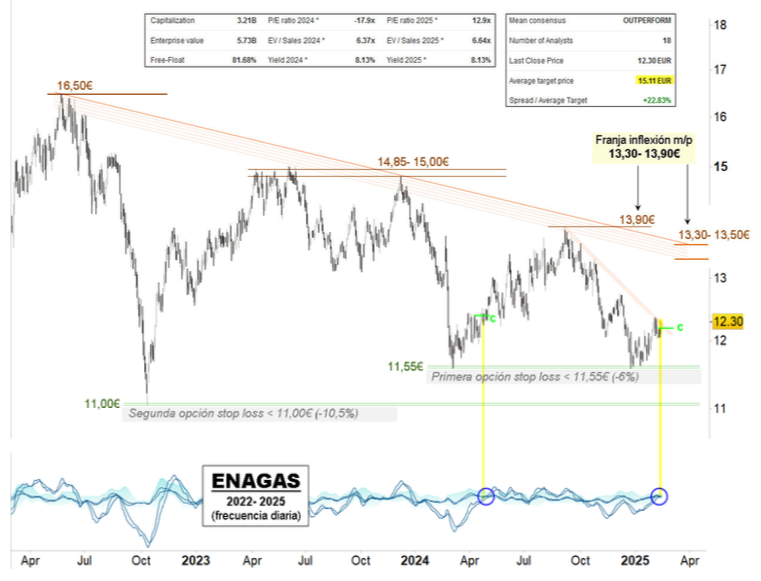 La zona por arriba donde se presentan más confluencias importantes abarca desde 13,30 hasta 13,90 euros, representando una franja de inflexión al alza clave, de cara al medio plazo. La primera zona de stop loss se situaría debajo de 11,55 euros, mínimos de 2024, un 6% por debajo de los niveles actuales.