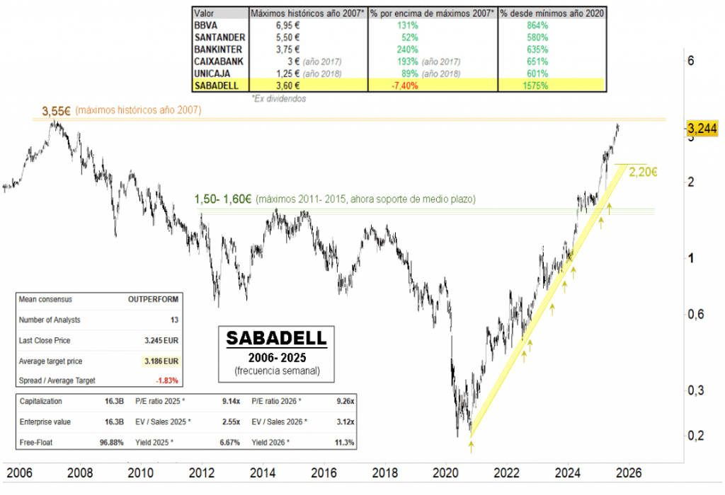 Renta 4 | Siendo el banco que, con diferencia, más se ha revalorizado desde los mínimos de 2020 (+1575%), es el único que, por ahora, se mantiene por debajo de los máximos históricos del año 2007, en su caso los 3,55 euros, ex dividendos. El precio presenta dos niveles de capital importancia, a saber, los máximos históricos comentados y la zona del paso de la directriz alcista desde los mínimos de 2020, en 2,20 euros. Una mejora de la oferta de adquisición por parte del BBVA probablemente marcaría el hito de los nuevos máximos de toda su historia bursátil.