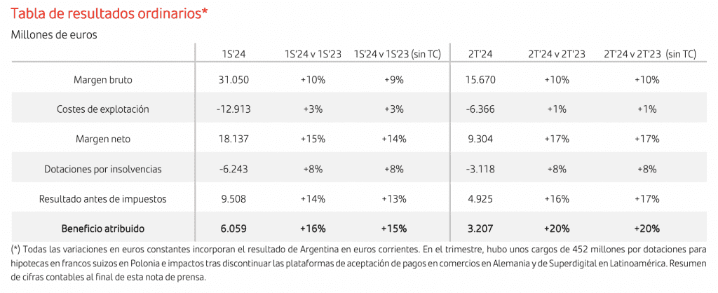 «Los otros resultados de explotación registran un importe negativo de 972 millones de euros (frente a un importe también negativo de 993 millones de euros en el primer semestre de 2023). Estos resultados incluyen principalmente el impacto negativo por el ajuste por hiperinflación en Argentina (687 millones de euros), y el gravamen temporal a los ingresos obtenidos en España contabilizado en el primer trimestre de 2024 por un importe de 335 millones de euros, frente a los 224 millones de euros en el primer trimestre de 2023.Los resultados de 2024 no recogen ninguna aportación al Fondo Único de Resolución (293 millones de euros brutos contabilizados en el segundo trimestre de 2023)».