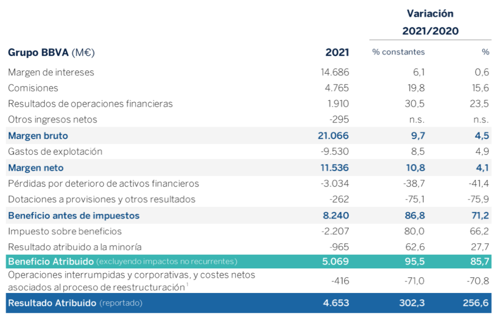 Excluyendo impactos no recurrentes, el beneficio atribuido de BBVA en 2021 alcanzó 5.069 millones de euros (+95,5%), lo que supone prácticamente duplicar los resultados del ejercicio 2020. Se trata del mayor resultado recurrente de los últimos diez años, gracias «al buen comportamiento de los ingresos y a las menores provisiones crediticias».