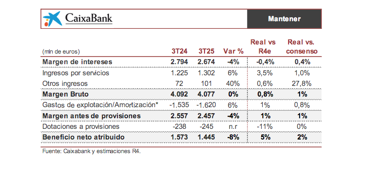 Renta 4 | Los resultados de 3T25 han mostrado un margen de intereses alineado con las estimaciones tanto nuestras como las de consenso y unos ingresos por servicios +3% vs R4e (+1% vs consenso). El margen bruto, +1% vs R4e y consenso, se apoya en la mayor aportación de otros ingresos. El comportamiento de los ingresos permite absorber unos gastos de explotación un +1% superior a lo estimado vs R4e y consenso. La mejor lectura de las provisiones vs R4e (-11%) explica que el beneficio neto haya superado en un +5%, mientras que en comparativa con el consenso se ha situado un 2% por encima. Homogeneizando el impuesto a la banca en 2024, el beneficio neto en 1S25 arroja un crecimiento del +1% y el RoTE se sitúa en el 17,6%.