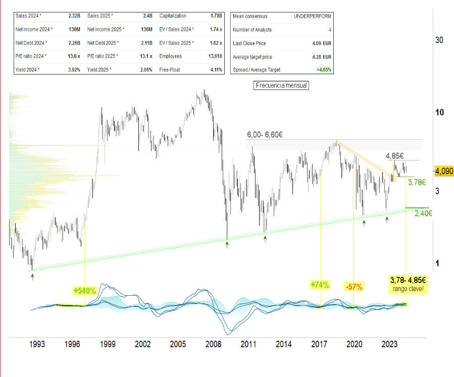 Teniendo en cuenta el proceso lateral que arrastra desde mayo 2023 entre 3,78 y 4,85 euros, pensamos que la salida de este rango lateral marcará la clave operativa en el valor.