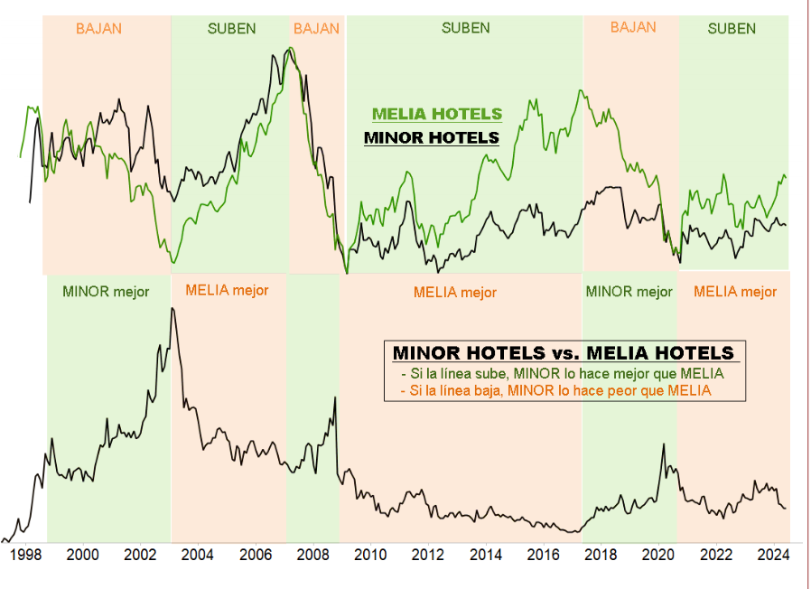 En este análisis también exponemos el diferencial de comportamiento entre Minor Hotels y Meliá Hotels a través del tiempo. En este diferencial se aprecia un comportamiento muy curioso, que un inversor debería tener en cuenta a la hora de hacer un stock picking en el sector. De este modo, cuando el ciclo es alcista y las hoteleras suben, Meliá siempre se ha venido comportando mejor que Minor, y viceversa, ante ciclos de caídas, Minor lo ha venido haciendo mejor que Meliá. En este sentido, si pensamos que el ciclo alcista nacido en los mínimos de 2020 puede continuar, nuestra preferencia por Meliá parece clara.