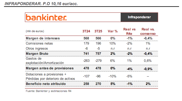 De los resultados destacamos: 1) el margen de intereses crece +1% intertrimestral en 3T25 y se mantiene plano en comparativa interanual (vs +0,6% i.a. R4e y 0% consenso), con un margen de clientes manteniéndose en niveles del 2,7% en línea con la guía 2) Las comisiones netas aumentan +10% intertrimestral en 3T25 (vs +11% interanual R4e y +8% i.a. consenso), y al c.+11% interanual en 9M25, apoyado por las comisiones de gestión de activo y brokerage, +13% i.a. y 53% del total de las comisiones, 3) los gastos de explotación moderan el ritmo de crecimiento por tercer trimestre consecutivo, +6% interanual 3T25 (vs +16% interanual 1T25 y +7% interanual 2T25), lo que lleva a un avance de +9% interanual lejos de la guía de avance a un dígito medio-bajo para el año, 4) El coste de riesgo se sitúa en 33 p.b. que compara favorablemente con la guía de 35-40 p.b. para 2025 (vs 32 p.b. 2T25), y 5) Generan +37 p.b. de capital en el trimestre hasta situar el ratio CET 1 en el 12,94%.