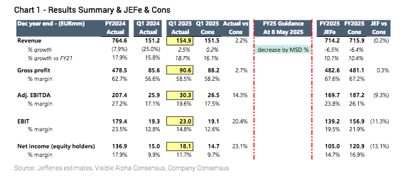 Jefferies | El 1T25 fue superior a lo esperado en ventas y un 14% superior a lo esperado en EBITDA. El crecimiento de las ventas del 2%, frente a la previsión de un «descenso moderado», se debió a que Spec Pharma registró un aumento de las ventas del negocio de HBPM. Se espera que esto se vea compensado en el primer semestre de 2005. La aceleración de Okedi y el descenso de los precios de las materias primas de la heparina aumentaron los márgenes, lo que impulsó la mejora frente a las previsiones. También esperamos detalles sobre el escalonamiento del gasto. Se reiteraron las guías para el año.