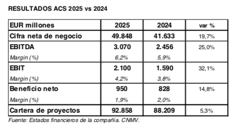 Link Securities | ACS (ACS) presentó el miércoles sus resultados correspondientes al ejercicio 2025, y su comparativa interanual, de los que destacamos los siguientes aspectos: