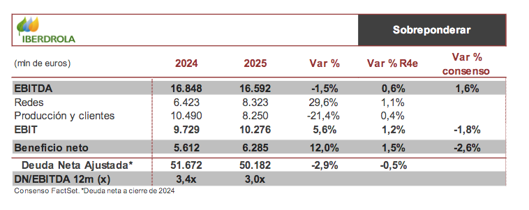 Renta 4 | Resultados 2025 alineados con las expectativas en todas las líneas de la cuenta de resultados. Las cifras siguen afectadas en su comparativa con 2024 por distintos efectos extraordinarios: las plusvalías que se generaron en 2024 con la venta de activos en México, mientras que este año se refleja la plusvalía de la venta de los smart meters y las desgravaciones fiscales de las inversiones en redes en Reino Unido, así como el reconocimiento de costes incurridos en años anteriores en las redes de Estados Unidos. En términos recurrentes el EBITDA crece +3,1% recogiendo: 1) redes impulsado por el fuerte desempeño en Reino Unido (consolidación total de ENW) y Estados Unidos, gracias a la mayor base de activos y tarifas, así como los efectos de la mayor inflación y tarifas en Brasil y algunos ajuste positivos en la retribución de años anteriores en España, y 2) en el negocio de producción y clientes la mayor producción y mayor capacidad renovable, no compensan el descenso de los márgenes y el aumento de los costes de servicios complementario en España que desciende más del 15%; en Estados Unidos el mejor rendimiento de la energía eólica y solar impulsan el crecimiento del EBITDA, a pesar del efecto positivo en el 2024 relacionado con la tormenta Arctic Blast; en Reino Unido menor EBITDA del negocio de comercialización debido a los precios y los volúmenes, junto con un menor recurso eólico y menores precios, así como la desconsolidación de East Anglia, son compensado por la plusvalía de la venta de los smart meters; además se recoge una mayor aportación de los proyectos de eólica marina de St. Brieuc y Baltic Eagle. En lo que se refiere al beneficio neto, la mejora corresponde al efecto positivo de las desgravaciones fiscales de las inversiones en redes en Reino Unido y las plusvalías de los smart meters, así como un mejor resultado de minoritarios.