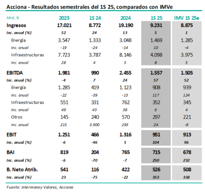 Intermoney | Acciona (ANA) (Comprar, Precio Objetivo 200 euros/acción) publicó sus resultados del 1S25 el lunes tras el cierre del mercado, junto con su filial cotizada Acciona Energía (Comprar, PO 26 €), y celebrarán este martes una conferencia telefónica conjunta a las 11h, a la que es posible registrarse en este link.