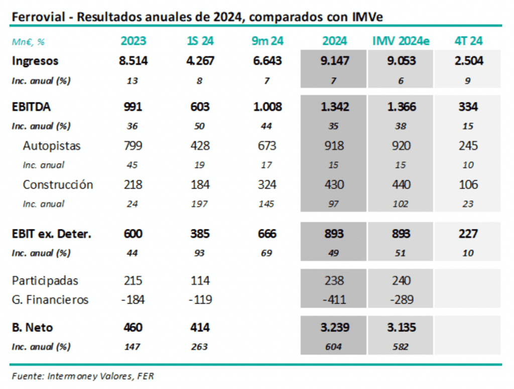 Las cifras principales de los resultados, junto a nuestras estimaciones, se muestran en la tabla adjunta. En conjunto, el EBITDA se elevó un +35% hasta 1.342 Mn€ en el conjunto de 2024, frente a +38% IMVe, lo que confirmó las mejoras de márgenes en construcción, combinado con algo menores crecimientos en Autopistas, otra tendencia ya observada también en pasados trimestres. FER reportó en esta ocasión cifras por debajo de EBIT, incluyendo un resultado neto de 3.239 Mn€, frente a 3.135 Mn IMVe, al incluirse los anunciados más de 2.500 Mn€ de plusvalías por la venta parcial de Heathrow.