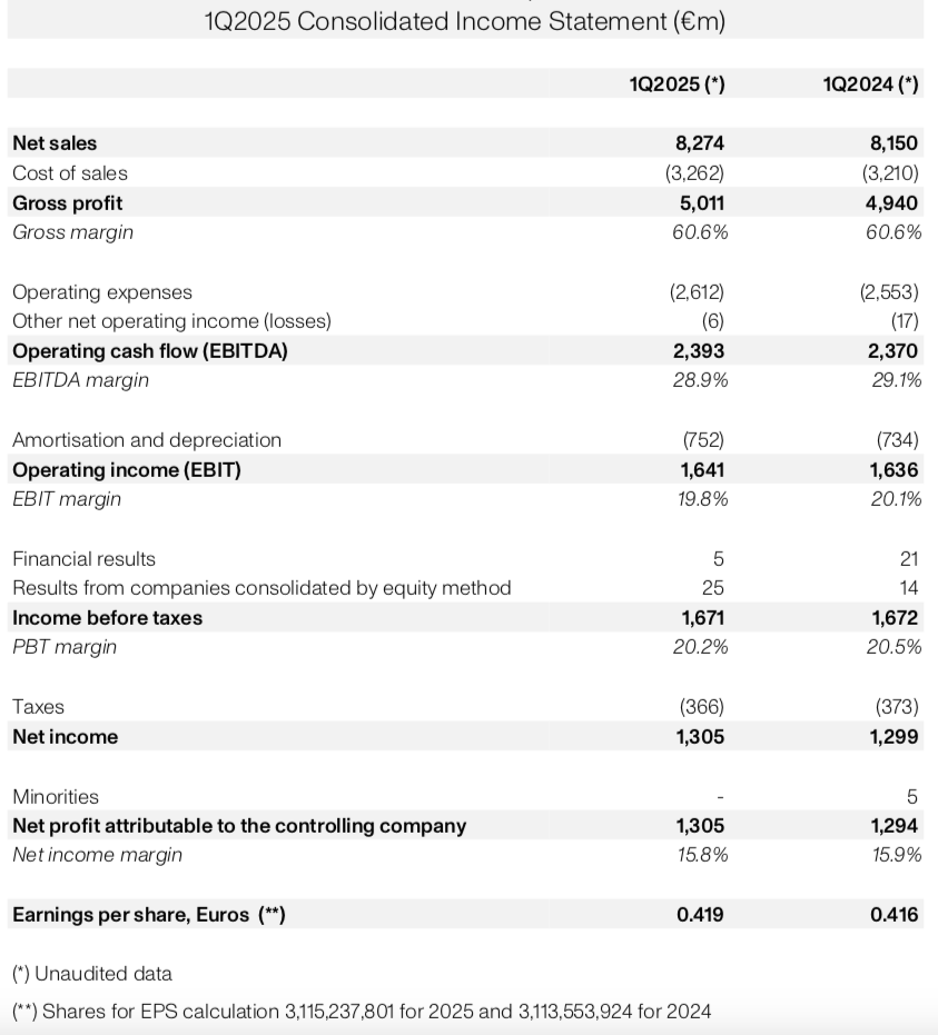 Principales cifras comparadas con el consenso: Ventas 8.274 M€ (+1,5%) vs 8.383 M€ (+2,9%) esperado. Margen Bruto 5.012 M€ (+1,5%) vs 5.083 M€ (+2,9%), lo que supone un margen de 60,6% vs 60,6% esperado. EBITDA 2.393 M€ (+1,0%) vs 2.431 M€ (+2,6%); EBIT 1.641 M€ (+0,3%) vs 1.653 M€ (+1,0%); BNA 1.305 M€ (+0,9%) vs 1.304 M€ (+0,9%). Los costes operativos aumentan +2,3% y el inventario 6%. La caja neta disminuye hasta 10.778M€ (vs 11.495 M€ a cierre de 2024).