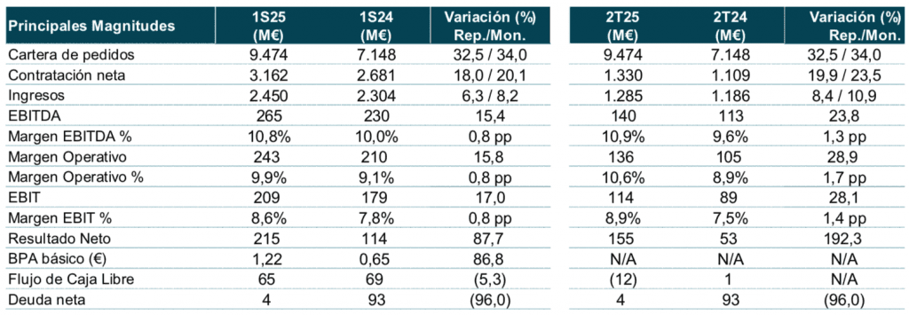 Las cifras principales comparadas con el consenso de analistas: Ventas 1.285 (+8,4% a/a) vs 1.278M€ (+7,7%) esperado; La cartera de pedidos se sitúa en 9.474M€ de los cuales 1.449M€ corresponden a la consolidación de Tess Defense. Excluyendo el impacto la cartera de pedidos crece +12% a/a; EBIT 114,0M€ (+28,1%) vs 108,8M€ (+22,2%) esperado, que supone un margen EBIT de 8,9% (vs 8,5% esperado); Beneficio Neto 155M€ (+192%) vs 69,5M€ (+30,6%) esperado, aunque éste último distorsionado por la consolidación de Tess Defense.