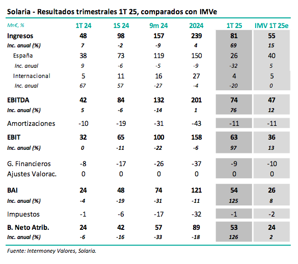Intermoney | Solaria (Mantener, PO 12 €) anunció sus resultados del 1T 25 hoy con el mercado abierto, celebrando una presentación a las 18 horas. Las cifras principales, se muestran en la tabla adjunta, y reflejaron especialmente el impacto de la entrada de un nuevo socio, Stonepeak, en Generia Land en marzo, que estimamos contribuyó unos 51 M€ a nivel de ingresos. Los ingresos crecieron así un +69% hasta 81 M€ frente a nuestra previsión de 55 M€; sin contar Generia, ceteris paribus, estimamos que esta cifra hubiese caído un -38%. El EBITDA, por su parte, impactado por Generia también, subió un +76% hasta 74 M€ (+12% IMVe), aunque pensamos que, sin ese factor, hubiese quedado muy por debajo de IMVe. Sin mayores sorpresas por debajo de esta línea, el resultado neto se elevó un +126% hasta 53 M€, frente a 24 M€ IMVe. La empresa anunció la recompra de hasta el 10% de su capital. Ajustaremos nuestras previsiones los próximos días tras las cifras de hoy, que apenas variamos en el previo para el periodo 25e-27e respecto a las cifras que teníamos en febrero, y que implican un TACC en el EBITDA del 16% en 24-27e. Nuestra cifra de EBITDA en 25e, 220 M€, queda por debajo de la guía de la empresa, reiterada hoy de 245-255 M€, aunque excluyendo Generia estaríamos un +10% por encima.