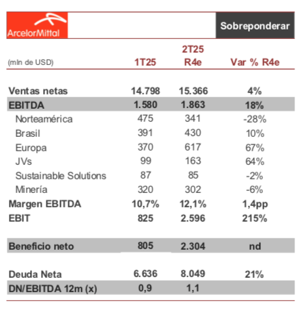 Renta 4 | Esperamos que los envíos avancen +2,3% vs 1T 25 (Norteamérica +4%, Brasil +2% tras la fuerte caída por estacionalidad en 1T y Europa +1% y precios +5% vs 1T 25 (Norteamérica y Brasil +1% y Europa +8%, tras la fuerte caída en los dos trimestres anteriores). Esperamos que las JVs aporten 163 mln USD al EBITDA (vs 99 mln USD en 1T 25) con mejor tono en la India, que ha estado muy presionada en los últimos trimestres por las importaciones de China, y que la contribución de Sustainable Solutions alcance 85 mln USD (87 mln USD en 1T 25). En Minería la caída de precios (-5%) debería repercutir en ingresos y EBITDA, para los que esperamos una caída moderada vs 1T 25. Así, esperamos que a nivel grupo los ingresos crezcan +4% hasta 15.366 mln USD, EBITDA +18% vs 1T 25 hasta 1.863 mln USD y resultado neto 2.304 mln USD (vs +825 mln USD en 1T 25) con gran impulso de la compra de Calvert (+1.500 mln USD sin impacto fiscal).