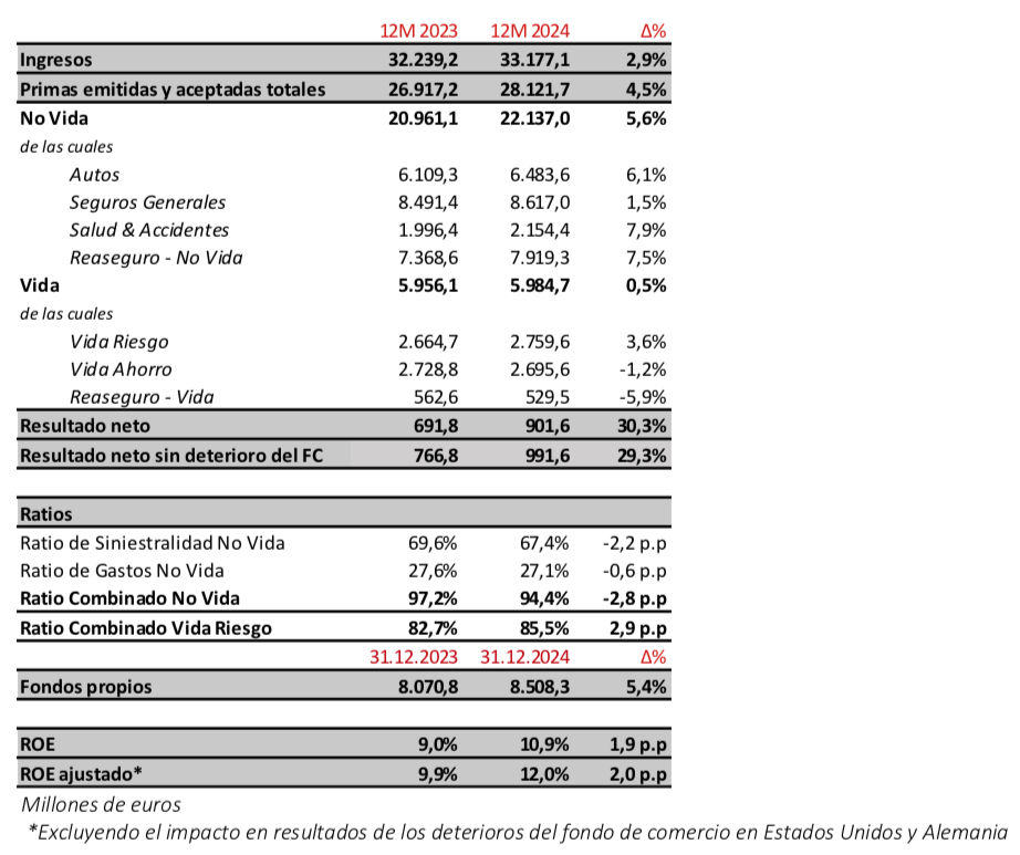 Las primas crecen en 2024 de forma sólida (+6,6% a tipo de cambio constante) hasta 28.122M€, batiendo las expectativas. La mayor sorpresa llega por el lado de los márgenes. El ratio combinado No Vida se sitúa en 94,4% (vs 97,2% en 2023), a pesar de que la presión sobre los márgenes persiste en el segmento de autos. Impulsa el resultado técnico que, junto al resultado financiero, más que compensan la caída en el resultado del ramo de Vida.