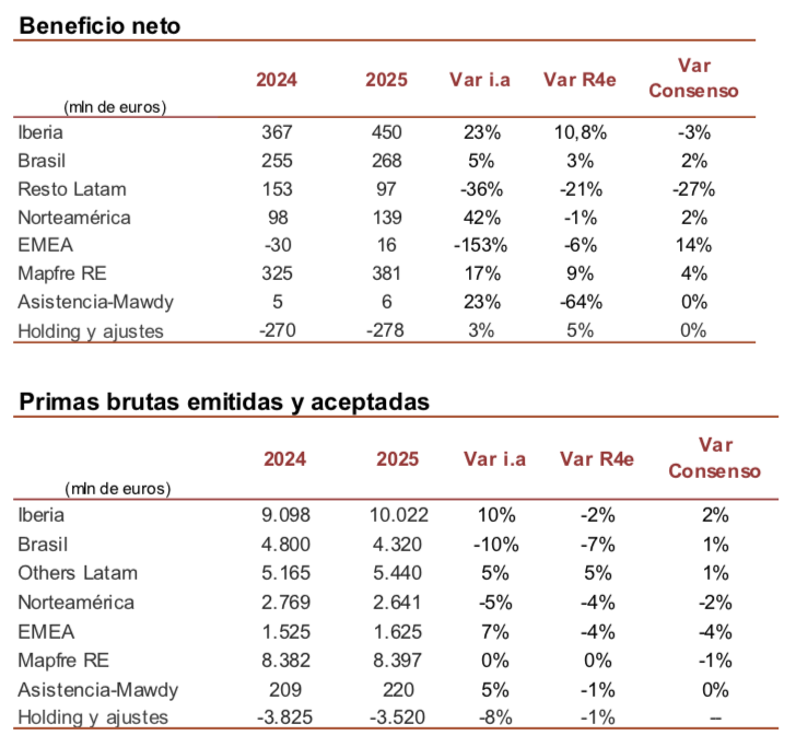 Renta 4 | Los resultados 2025 de Mapfre han mostrado una lectura mixta, con primas en el ramo de No Vida ligeramente por debajo de las estimaciones (-2% vs R4e y -1% vs consenso) y un beneficio neto +3% vs R4e y -2% vs consenso. Mejor ratio combinado vs esperado y unas primas del ramo de Vida alineadas con nuestras estimaciones y un +3% superior al consenso.