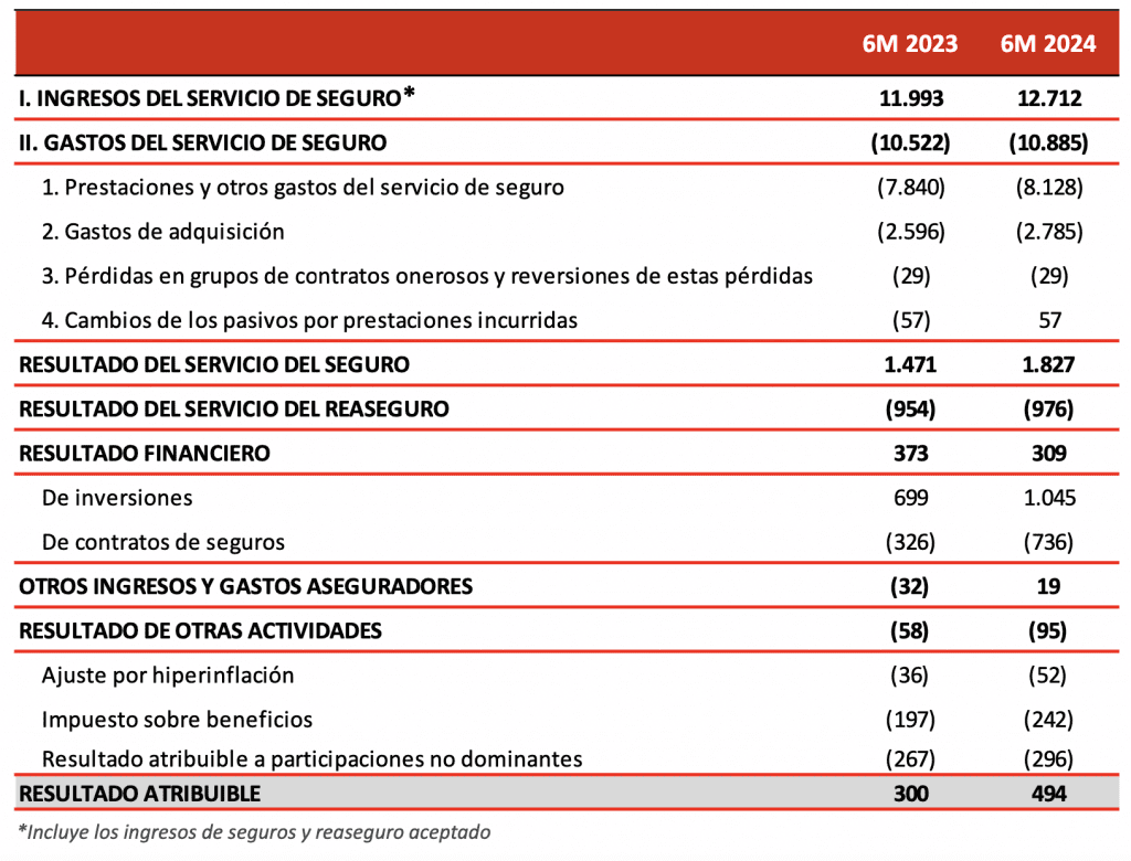Cifras 2T 2024 (vs consenso): Primas 7.002M€ (+6,7%) vs 6.965M €, Beneficio neto 245M€ vs 215M€, Ratio Combinado No Vida 95,7% vs 96,5%, Solvencia 197,7% vs 199,6% anterior.