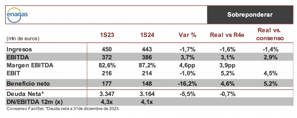 El flujo de caja operativo se eleva +9% como consecuencia de que en 1S23 se registraron los efectos negativos extraordinarios de los impuestos pagados por la venta de GNL Quintero y Morelos, si bien si excluimos este efecto, se habría situado algo por debajo por mayor deterioro de circulante. Un circulante que estaba previsto que tuviera este comportamiento y lo siga teniendo a lo largo de este año tras la fuerte recuperación en 2023 por la alta utilización de las infraestructuras de la compañía, especialmente las plantas de regasificación. Con todo ello la deuda neta se reduce más de un 5% respecto a la registrada en 2023, junto con el apalancamiento DN/EBITDA ajustado por participadas hasta 4,1x.