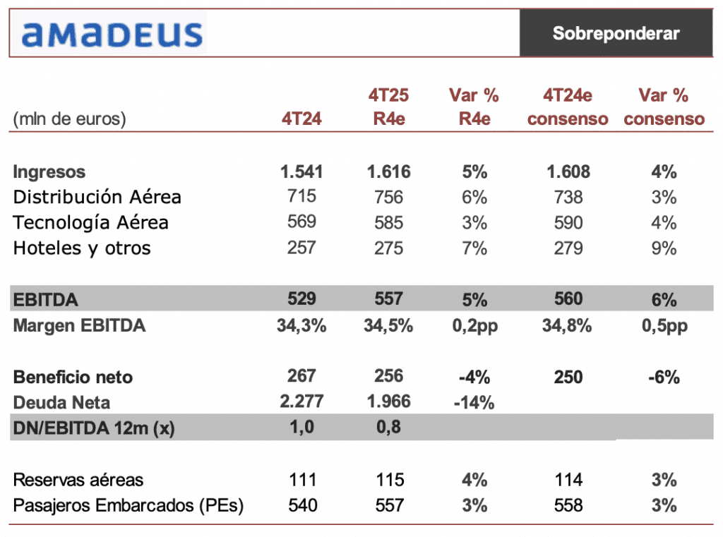 Calculamos que los Ingresos crezcan por tercer trimestre consecutivo a un dígito medio, +5%, afectados por la depreciación del USD (-9% vs Eur), con Distribución +6%, Tecnología aérea +3% Hoteles +7%. EBITDA 557 mln eur, +5% vs 4T 24, margen EBITDA 34,5% (+0,2 pp vs 4T 24) y beneficio neto 256 mln eur (-4% vs 4T 24), con resultado financiero -18 mln eur (-19 mln eur en 4T 24) y tasa fiscal 21,5% (11% en 4T 25).