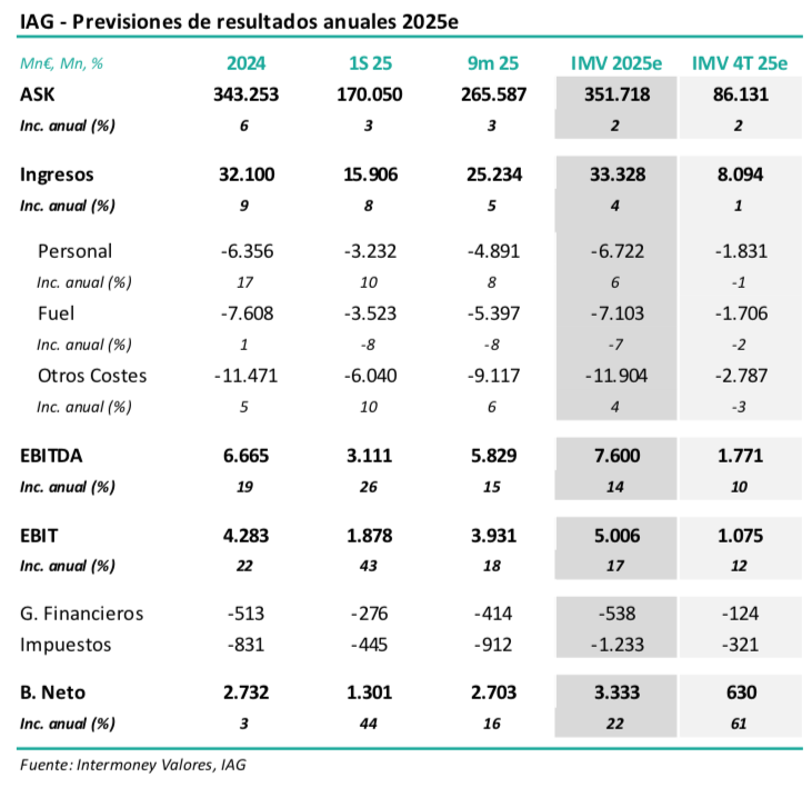 Esperamos que el Grupo combine unos crecimientos moderados de ASK en todas las geografías de la red con, en especial, unos menores costes de combustible, lo que cual le permitiría elevar el Ebit un +17% hasta los 5.000 millones de euros. La moderación relativa de costes financieros impulsaría el beneficio neto un +22% hasta superar los 3.300 millones de euros. Estimamos una deuda neta a fin de 25e de 6.700 millones de euros, o menos de 1x Ebitda, tal y como guio el Grupo. No variamos nuestras estimaciones a largo plazo (25e-28e) con las que reiniciamos cobertura del valor el pasado 28 de enero, que muestran un +6% TACC en EBIT y EBITDA 25e-28e.
