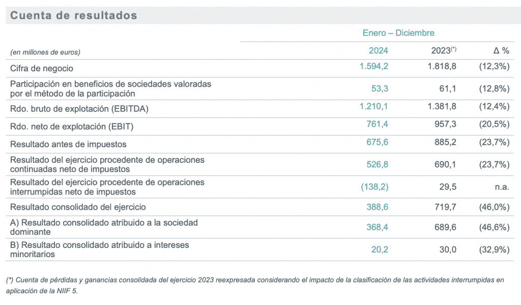 Bankinter | Resultados en línea. Hacia una mejora en la senda de ingresos regulados en el próximo periodo regulatorio. Principales cifras comparadas con el consenso: EBITDA 1.210M€ (-13%) vs 1.213M€ estimado; BNA recurrente 527M€ (-24%) vs 510M€ est; BNA total 368M€ (-47%); Fondos Generados por las Operaciones (FFO) 1.187M€ (+16%); Deuda Neta 5.370M€ vs 4.975M€ en diciembre 2023.