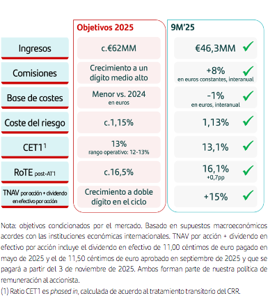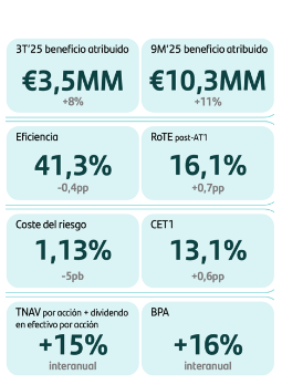 El grupo continuó aumentando la rentabilidad y la creación de valor para los accionistas, con un retorno sobre el capital tangible (RoTE) del 16,1% (+0,7 puntos porcentuales) post-AT1, un beneficio por acción (BPA) de 0,66 euros (+16%) y un valor contable tangible (TNAV) por acción de 5,56 euros al cierre de septiembre de 2025. Al incluir el dividendo en efectivo de 11,00 céntimos de euro abonado en mayo y el dividendo a cuenta de 11,50 céntimos que se pagará en noviembre, la creación total de valor (TNAV más dividendo en efectivo por acción) aumentó un 15% interanual.