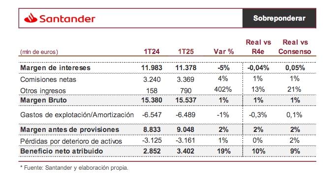 Renta 4 | Los resultados 1T25 se han situado en línea con las estimaciones R4e y consenso en ingresos y gastos de explotación. El margen bruto se sitúa un +2% vs R4e y consenso, mientras que el beneficio neto supera en un +10% R4e y +9% consenso. Si excluimos Argentina, las cifras muestran una lectura algo mejor en margen bruto superando en un +1,2% vs consenso. En el conjunto del Grupo destacamos: 1) Los ingresos crecen al 1% i.a. en 1T25 (vs +8% i.a. 2024) y al c.+5% a tipos constantes (vs c.+10% i.a. 2024), apoyado por comisiones netas (+4% i.a.) y mayores ROF (c.+9% i.a. y +12% vs R4e y consenso), 2) la tasa de morosidad se sitúa en el 2,99% (vs 3,05% en 2024), con aumentos trimestrales en Brasil y Chile, y el coste de riesgo en 114 pb (-1 pb i.t. y -6 pb i.a.), donde también se ve una subida vs 4T24 en Brasil de +10 pb, 4) El RoTE del Grupo se sitúa en 16,6%, 15,8% post AT1, y 5) El CET 1 “fully loaded” aumenta en 10 pb en el trimestre hasta 12,9%, tras generar 33 pb orgánicamente que se ha compensado con 27 pb de consumo por dividendos, con un impacto negativo por BIV de -8 pb y el efecto positivo de +12 pb de otras variables.