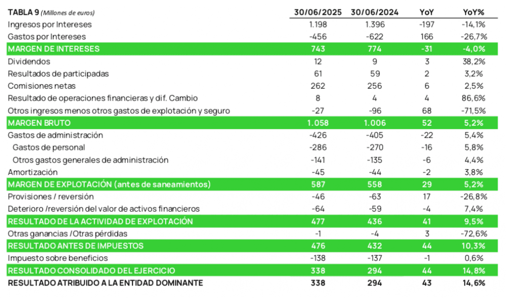 Principales cifras 1S 2025 comparadas con lo esperado por el consenso: Margen de Intereses: 743 M€ (-4,0% vs -5,6% en 1T 2025 vs 732 M€ e); Margen Bruto: 1.058 M€ (+5,2% vs 1.040 M€ e); Margen de Explotación: 587 M€ (+5,2% vs 569 M€ e); BNA: 338 M€ (+16,6% vs 323 M€ e).