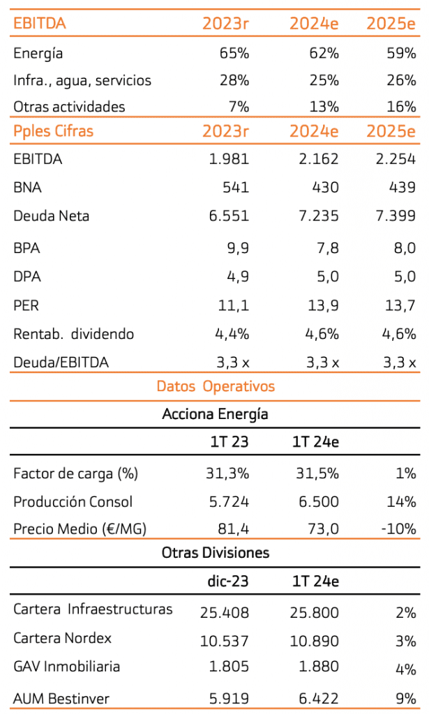 Ajustamos ligeramente a la baja estimaciones y el precio objetivo del grupo, pero mantenemos la recomendación en Comprar. El principal motivo es el recorte en estimaciones y valoración en Acciona Energía debido a unos precios de la electricidad inferiores a lo inicialmente estimado. Una débil demanda, un alto peso de renovables en el mix eléctrico y menores precios del gas impactan negativamente sobre el precio del pool eléctrico. La política de coberturas y los contratos a largo plazo permitirán mitigar en parte este impacto, pero el entorno de precios es de mayor debilidad de lo anticipado.