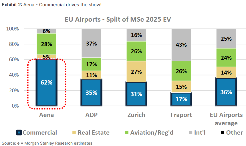 Morgan Stanley | Nuestro analista Nic Mora hace un preview de resultados en el sector de aeropuertos y repasa los 2-3 puntos clave a vigilar para cada una de las compañías. En general, Mora se mantiene constructivo sobre ADP cara a resultados, más neutral en Aena, Fraport, AIA y mira con cautela los de Zurich, donde mantiene un UW. Más allá de los resultados (ADP 19 Feb / AIA 24 Feb / Aena 26 Feb / Zurich 7 Mar / Fraport 18 Mar), Mora mantiene su preferencia por el modelo de negocio de Aena, conjugando una estrategia dirigida al aumento de tráfico, con opcionalidad alcista en el segmento retail y planes de aumento de capex, con retornos sólidos. AENA, OVERWEIGHT, DE 236 A 244 EUROS.