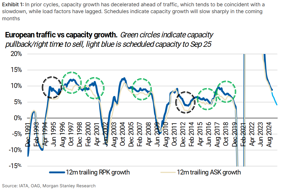 Morgan Stanley | La desaceleración del aumento de capacidad ha sido históricamente el mejor indicador adelantado de late-cycle para las aerolíneas europeas, aunque Conor Dwyer (analista) reconoce que el timing no es preciso, por lo que hay que monitorizar también otros factores. En ciclos anterior, el crecimiento de capacidad hizo pico en el 9-12%, y en este, alcanzó el 8% en enero, y se espera que caiga al 4% en septiembre. La cuestión es que el comportamiento relativo del equity en un late-cycle normalmente es bueno a medida que una menor capacidad da soporte a los ingresos (yield).