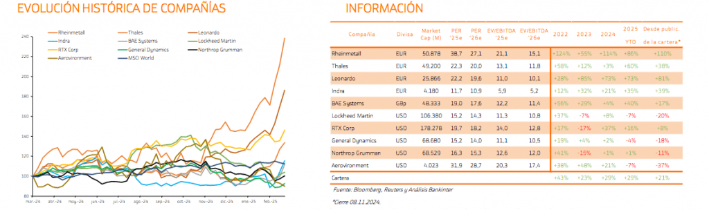 Bankinter | Continúa el buen momento para el sector y nuestra cartera temática se revaloriza +30% en el año, especialmente gracias a los valores europeos. En febrero concluyó la Conferencia de Seguridad de Munich sin un acuerdo preliminar para poner fin a la guerra entre Rusia y Ucrania, aunque con una conclusión clara: Europa debe estar preparada y aumentar de forma significativa su gasto en defensa. En línea con este argumento algunos de los países de la OTAN ya se han pronunciado al respecto. Entre ellos, el Primer Ministro de Reino Unido (Keir Starmer) afirmando que aumentará el gasto en defensa hasta el 2,5% s/PIB para 2027 con la “ambición” de elevarlo hasta el 3% en 2029. En este contexto, seguimos pensando que el sector presenta buenas perspectivas de cara a los próximos años: