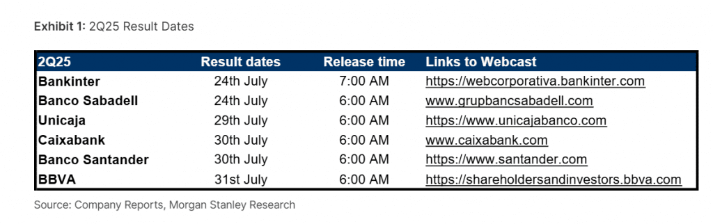 Morgan Stanley | Álvaro Serrano (analista) cree que el NII de los bancos españoles está cerca de tocar fondo en el 2T, y anticipa comentarios positivos que apunten a que el punto más bajo se alcanzará ya en el tercer trimestre. Prevé una caída del 1% en el NII del 2T25; sin embargo, la estacionalidad favorable, el crecimiento de volúmenes y el progreso en reducir la remuneración de los depósitos dejan margen para sorpresas al alza. Mantiene su hipótesis de un tipo del BCE en el 1,5%, lo que podría retrasar el punto de inflexión en NII hasta el 3T o 4T, aunque, con el giro en el NII ya inminente, ve posibilidades de un re-rating del sector. Finalmente comparte comentarios respecto a lo que espera de algunos bancos: