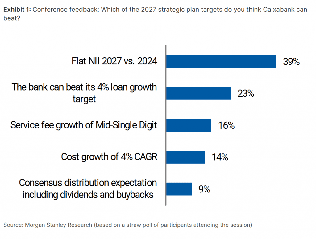 Morgan Stanley | Caixabank presentó ayer en nuestra conferencia de financieras en Londres. El tono fue bastante constructivo y confirmaron que las tendencias van por el momento por delante del plan estratégico. El entorno macro español ha ido mejorando desde noviembre, dando apoyo a una aceleración de la actividad tanto en préstamos como en fondos de clientes. El aumento en el consumo y la estabilidad laboral han sido un motor importante para los pagos (5% de crecimiento). El plan de estímulo alemán debería ser un punto de apoyo para España ya que Alemania es uno de los socios comerciales más importantes que tenemos y deberían darle apoyo a CaixaBank. El Management de la compañía reconfirmó que podrían ser capaces de batir guidance. EQUALWEIGHT, P.O. de 7,50 €.