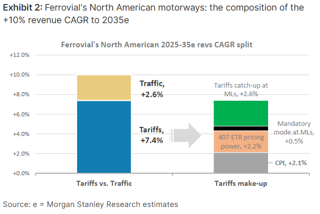 Morgan Stanley | Nic Mora (analista) repasa su cobertura de infra europea y no encuentra otra compañía con la capacidad de poder en precios de Ferrovial, especialmente en sus activos americanos. De las seis autopistas que gestiona en Estados Unidos, tres de ellas disfrutan de aplicación de precio libre y las otras tres tienen sus precios ligados a la inflación, además disfrutan de “mandatory 2x booster mode” cuando aumenta el tráfico y se encuentran en zonas de crecimiento rápido de población y de congestión de tráfico.