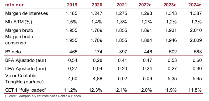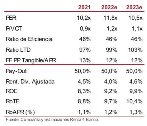 Para 2022, esperan que el margen de intereses crezca a un dígito bajo, y la cartera de crédito y las comisiones netas a medio dígito (vs +1,4%, +3% y +5% i.a 2022 R4e respectivamente). Compensando aumento a un dígito bajo de los gastos de explotación, que no descartamos podría ser algo superior ante el aumento de la inflación. En cuanto al coste de riesgo de crédito, la guía la sitúan en 40 pbs (vs pbs 2022 R4e) sin descartar mejora según avance el año (vs rango normalizado 35 – 40 pbs).