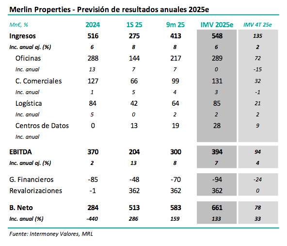 de la apertura del mercado, celebrando una conferencia telefónica ese día a las 15 horas. Esperamos que la socimi siga registrando crecimientos sólidos de ingresos/rentas (+6% IMVe hasta 548 M€), debido a la creciente aportación de los centros de datos (CdD), la incorporación de la inflación en la mayoría de contratos, así como a un cierto descenso de la desocupación en oficinas, parcialmente compensados por venta de activos. Considerando un cierto crecimiento en los costes de estructura, estimamos a diciembre un incremento de EBITDA en el entorno del +7% hasta 394 M€. Como es tradicional, no consideramos en nuestra previsión nuevas partidas de revalorizaciones, (+362 Mn€ a septiembre 25e), lo que conduciría a un beneficio neto de unos 661 Mn€, frente a 284 Mn hace un año. Corregimos ligeramente nuestras previsiones de EBITDA (1-2%) en 26e-27e tras incrementarlas un 4/5% en 25e-27e en nuestra nota de septiembre; consideramos entonces la Fase II de los centros de datos (246 MW), lo que implicó subidas de previsiones del +30% desde 28e.
