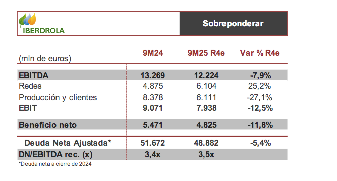 El EBITDA 9M25, seguirá condicionada por los efectos vistos en 1S: restando el reconocimiento de costes incobrables y de reparaciones medioambientales de años anteriores en las redes de Estados Unidos, menor recurso eólico y la desconsolidación de East Anglia en Reino Unido, los efectos negativos sobre los márgenes de comercialización e España y Portugal de la utilización de los ciclos combinados como servicios complementarios por parte del operador del sistema por una gestión más prudente tras el apagón de abril, así como la desconsolidación de activos vendidos en México y el tipo de cambio. En positivo, las mayores tarifas en Estados Unidos, la mayor base de activos en Reino Unido, la mayor producción en España, la mayor producción de la eólica marina por contribución de los proyectos de St. Brieuc y Baltic Eagle, y la aportación de ENW. Veremos si se registran los efectos de la venta de los smart meters en Reino Unido. Estos efectos esperamos que lleven al resultado neto (excluyendo plusvalías por desinversiones) a situarse en línea para alcanzar los objetivos de