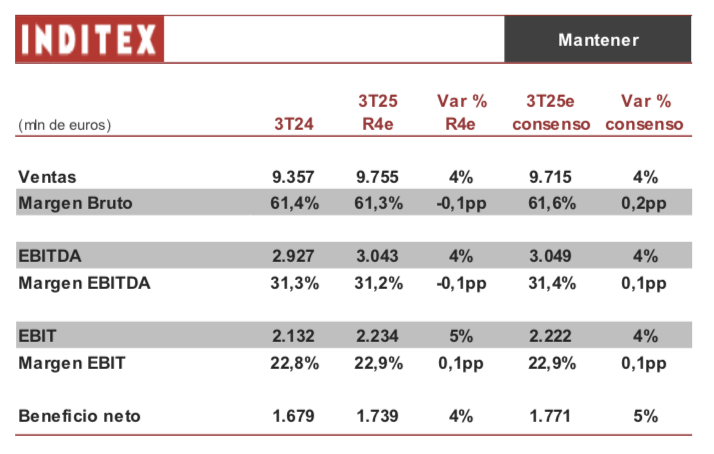 Renta 4 | Inditex (ITX) publica resultados 3T25 el miércoles 3 de diciembre antes de la apertura y celebrará la conferencia a las 9:00h. P.O. 50,0 eur. MANTENER.