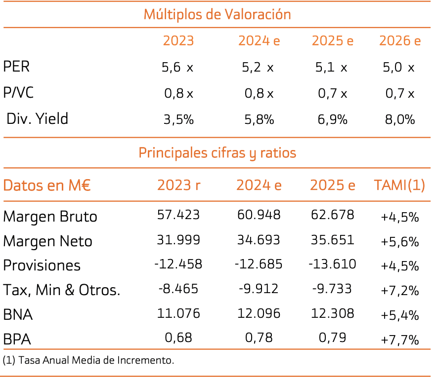 Bankinter | Banco Santander (SAN) avanza en la buena dirección para alcanzar los objetivos del plan estratégico 2023/2025 con una ratio de capital confortable (CET1 ~12,5% vs 12,3% en 1T 2024). Las cifras del 2T 2024 reflejan un buen momento en resultados y el equipo gestor revisa al alza el guidance 2024 en las partidas clave (Ingresos, eficiencia y rentabilidad/RoTE). Mantenemos recomendación de Comprar tras revisar nuestro Precio Objetivo hasta 5,65 €/acc. (vs 5,10 €/acc. ant.).