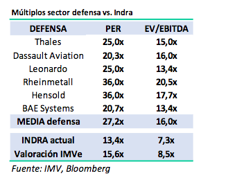 Indra, a pesar de su enorme revalorización en lo que va de año (+50%), se ha revalorizado menos que sus comparables europeos y sigue cotizando a unos múltiplos muy por debajo del sector defensa europeo. Indra cotiza actualmente a 13,4x PER y 7,3x EV/EBITDA 25e, mientras que el promedio del sector defensa europeo está en 27x PER y 16x EV/EBITDA. Por ello pensamos que los esfuerzos de Indra por transformarse en una compañía puramente defensiva le permitirán ir convergiendo hacia esos múltiplos.