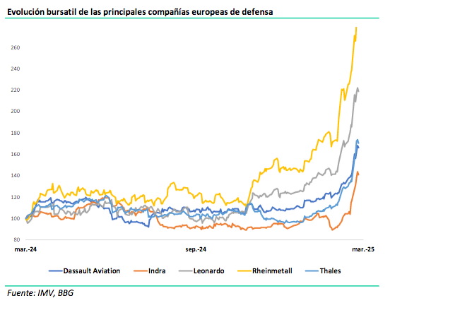 Intermoney | La UE ha instado a sus gobiernos a aumentar el gasto militar en al menos 1,5 puntos porcentuales del PIB, lo que implicaría un aumento de en torno a 650 Bn € en conjunto. Para ello presentarán un plan para proporcionar mayor flexibilidad fiscal a los gobiernos para impulsar su gasto en defensa.